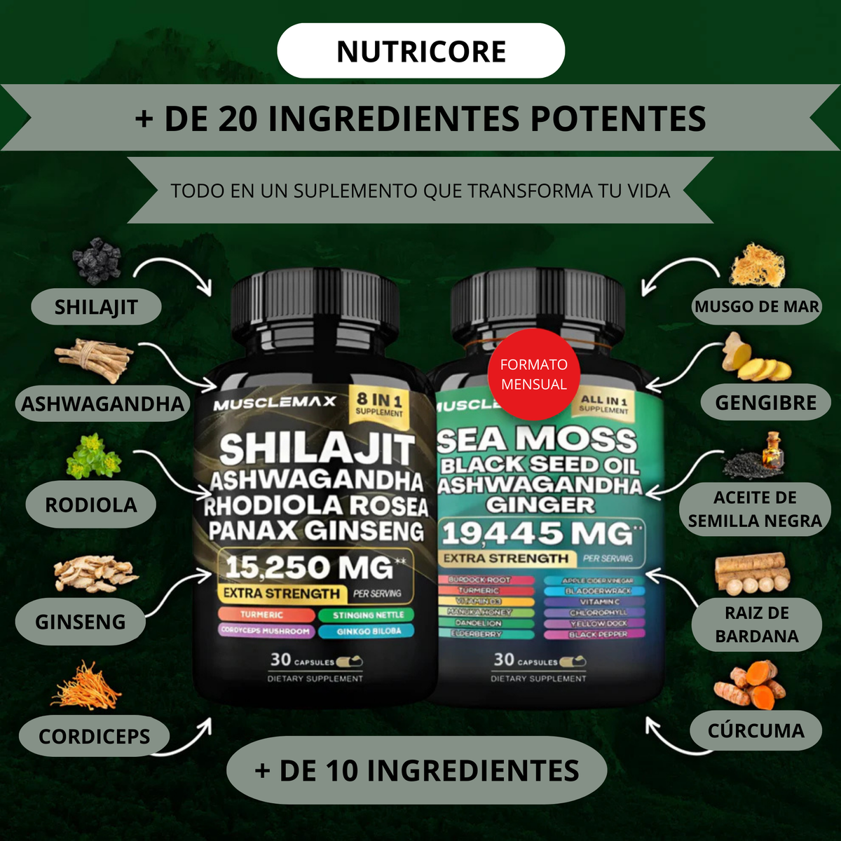 Aprovecha el poder de la naturaleza con nuestro potente paquete de musgo marino y shilajit. Con más de 20 minerales esenciales, antioxidantes y compuestos naturales, este dúo dinámico te ayuda en todo, desde aumentar la energía y la concentración hasta mejorar la inmunidad y la recuperación.